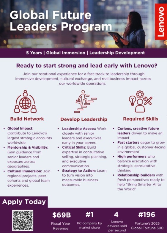 An exciting career opportunity for your graduating students. Lenovo Malaysia is inviting applications for our Global Future Leaders Program – a prestigious 5-year rotational experience designed to accelerate leadership development through global immersion, mentorship, and impactful projects.