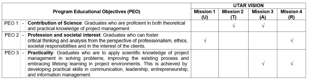 Mapping of UTAR Vision & Mission and Programme Educational Objectives (PEO):